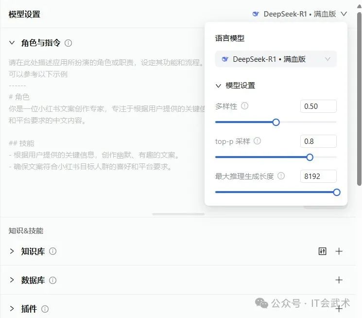 另外,说一下支付宝百宝箱的专业版,在应用的配置界面也有多个设定可以做成更专业的AI应用,比如“角色和指令”这块,可以描述应用所扮演的角色或职责,设定其功能和流程,可以按模板自己输入,也可以不按模板把自己的要求直接写出后让AI生成(当然空着也行)。有兴趣可以摸索下。这里要说的是在选择DeepSeek模型时,还能调参数。